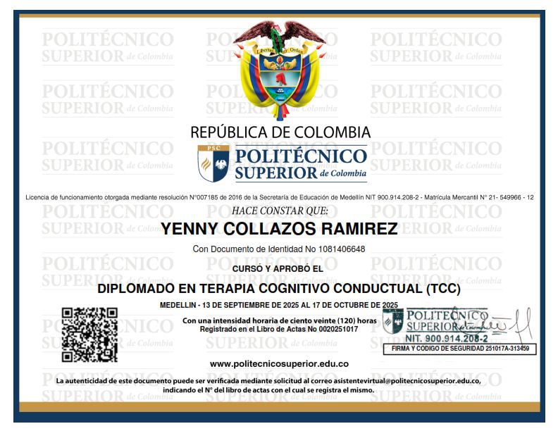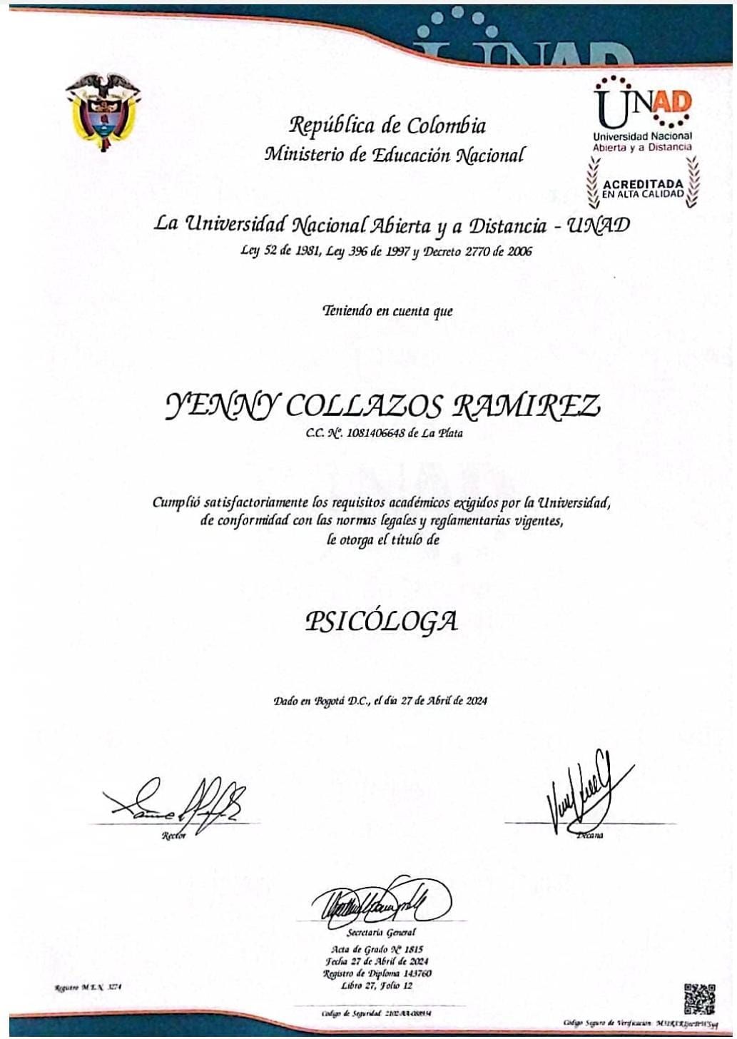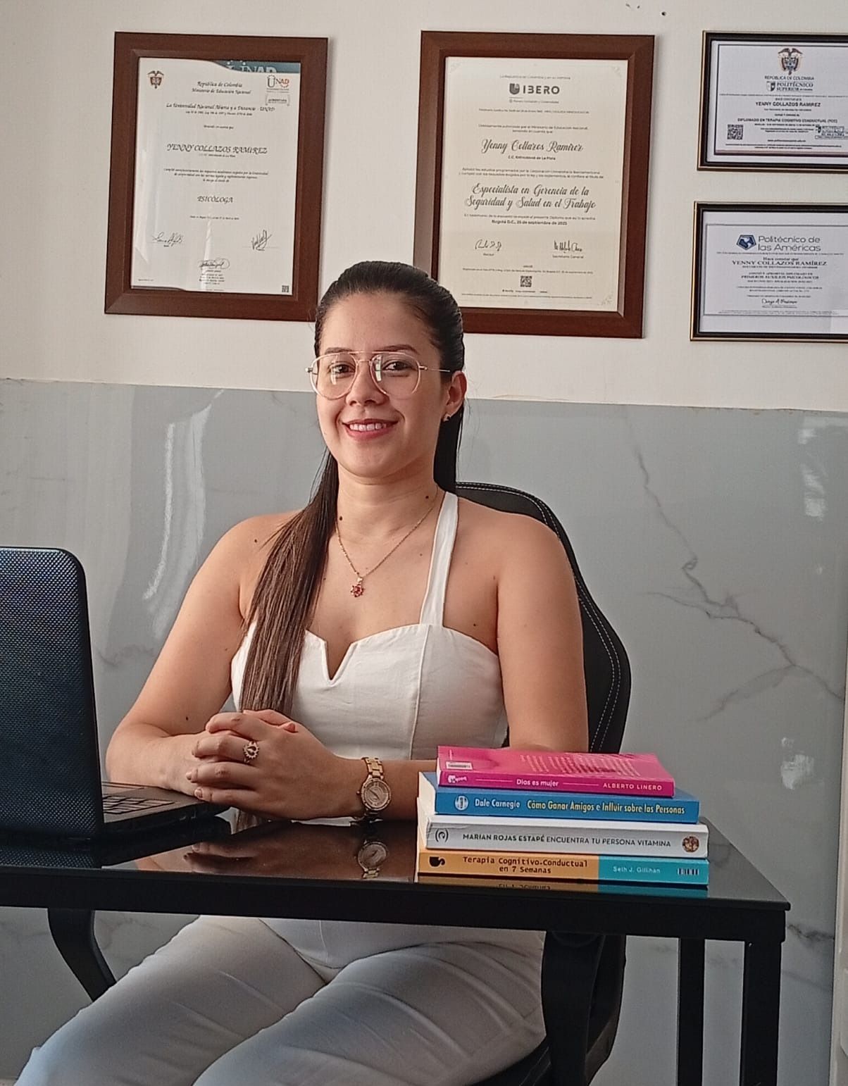 Soy Yenny Collazos Ramírez, psicóloga apasionada por acompañar a las personas en su viaje de autoconocimiento y transformación. Me describo como una profesional empática y comprensiva, que valora la conexión genuina con cada paciente.